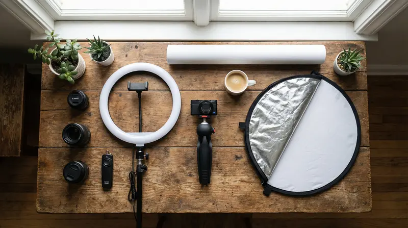 العاكس: استخدم لوح فوم أبيض (متوفر في أي مكتبة بأقل من 5 ريالات) وضعه على الجانب المقابل للنافذة. سيعكس الضوء ويملأ الظلال على الجانب المظلم من المنتج. النتيجة: إضاءة متوازنة واحترافية بدون أي تكلفة تُذكر.
